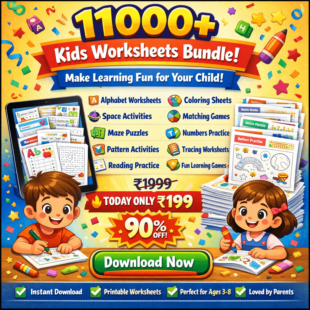 This bundle is perfect for kids aged 3β8 years. It covers preschool, LKG, UKG, and early primary skills with age-appropriate activities.